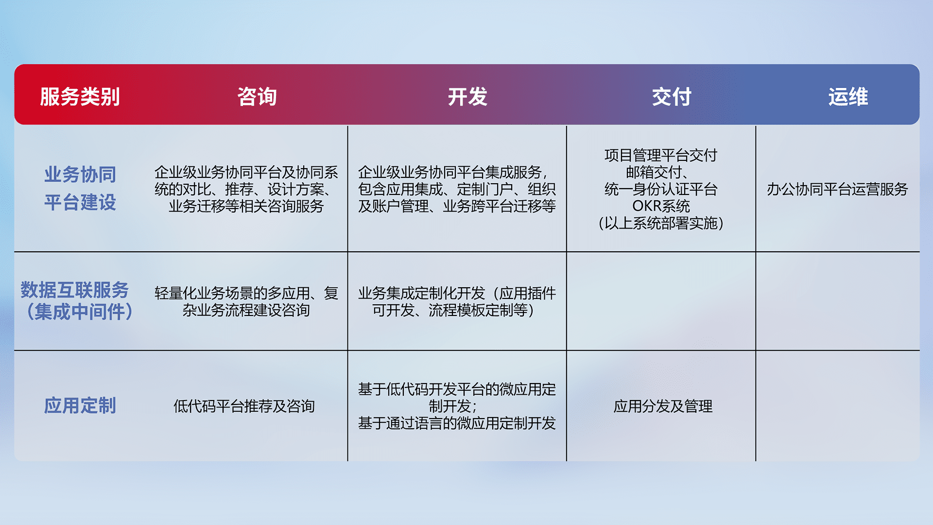 针对钉钉、、、企微、、、IDaas等平台级产品提供产品的规划、、方案、、、交付、、定制化开发等服务,,实现如统一协同办公、、、、智能客户服务、、、混合会议管理、、、智能数据查询、、等业务场景,,,,实现数字化转型。。。