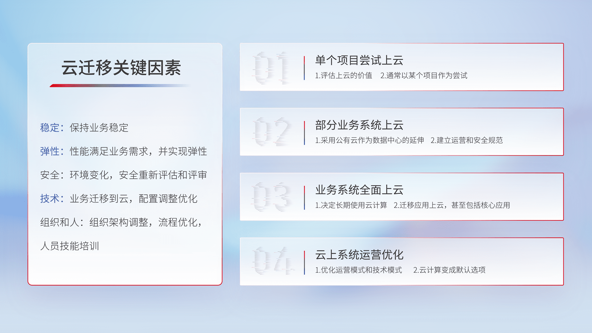 结合实际业务,,,,从规划设计、、、云平台选型、、、云原生改造、、、、数据迁移、、、集成交付,,,迁移全过程为客户识别最佳上云路径,,,,做好风险识别管理,,,,设计网络架构、、、身份权限、、、安全审计合规、、、操作审计、、、日志审计、、监控告警策略、、多站点容灾设计等,,对云上基础设施进行整体规划,,,提升IT治理水平,,以满足弹性、、、、高可用、、、、高性能的需求。。。。