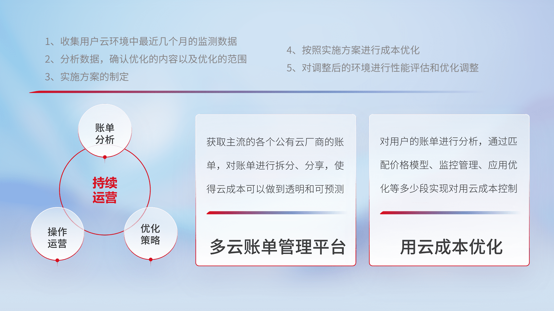 通过多云纳管,,,,以统一的资源数据模型把客户的云资源进行抽象和封装,,,进而实现对多云资源的统一操作,,保障云资源管理的可靠性、、、、稳定性与可用性。。量身定制化运维内容,,,配置、、开发运维、、、、补丁管理、、、备份、、、监控、、、、认证和访问管理、、、审计和日常巡检等,,,保障在用云过程中的可靠度,,,,稳定度以及高可用率。。。